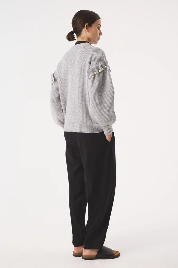 Yuki is a refined crew neck jumper crafted from soft grey marl RWS-certified wool, ensuring both quality and sustainability. Its subtle faux pearl buttons at the shoulder add an elegant detail, elevating this versatile piece. Ideal as a sophisticated layer, Yuki effortlessly enhances everyday outfits with understated style and comfort.